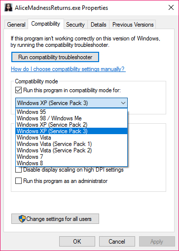 "AliceMadnessReturns.exe", and click the Compatibility tab. Set compatibility to